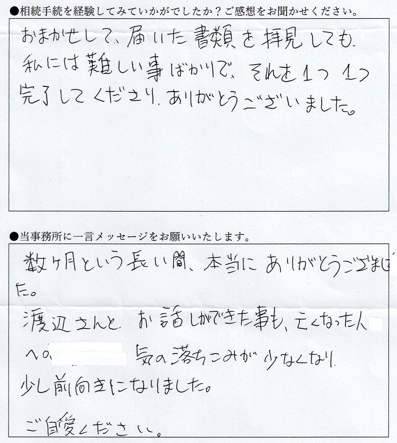 当事務所にご依頼いただいたお客様からは、「スムーズに相続手続きができてよかった」「遺産分割がまとまらないかと思っていたので助かった」などのうれしいお声が届いています。