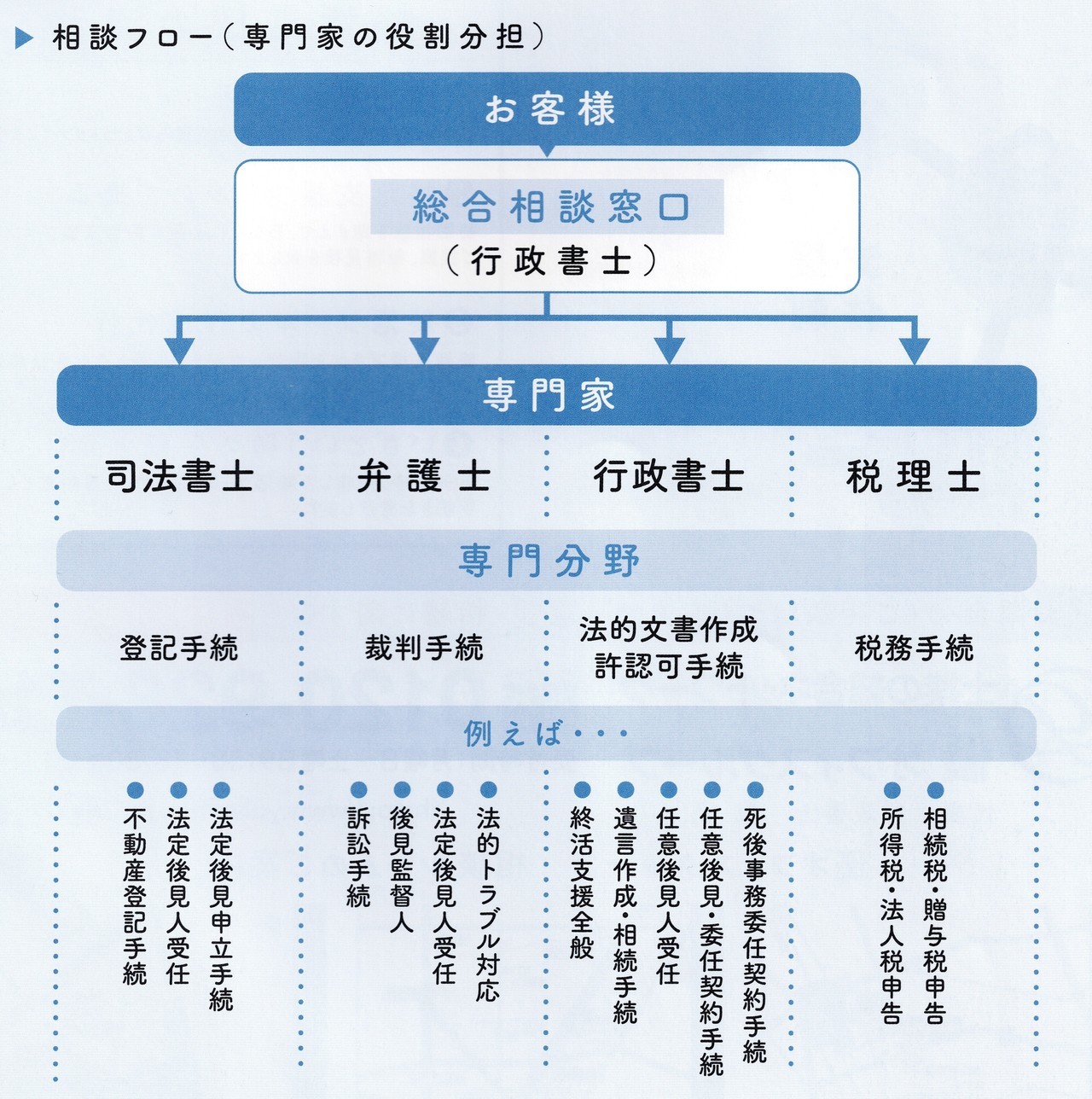 ひとくちに終活といっても相談したい内容は多岐にわたるうえ、それぞれの専門家が異なるのが実情です。どこに相談したらよいのか迷った時は、まず当事務所にご相談ください。当事務所は他の専門家とネットワークを構築しておりますので、あなたのご相談内容に応じて、最も効率よく問題を解決することが可能です。
