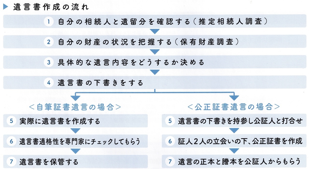 遺言書を作成する前提として、自分の相続人と法定相続分を確認するための「推定相続人調査」と、自分の財産がどこにどれくらいあるのか確認するための「保有財産調査」を行う必要があります。これらを確認することによって、遺留分なども考慮した真に公正妥当な遺言書を作成することができます。